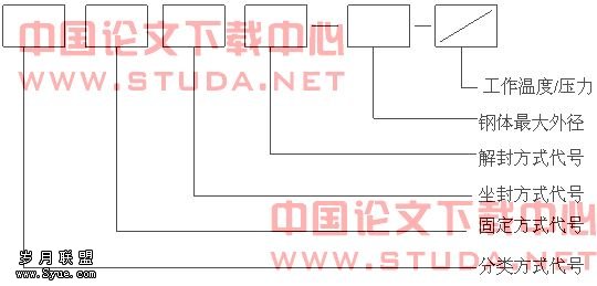 编制方法:按封隔器分类代号、固定方式代号、坐封方式代号、解封方式代号及封隔器钢体最大外径、工作温度/工作压差六个参数依次排列,进行型号编制,其形式如下: