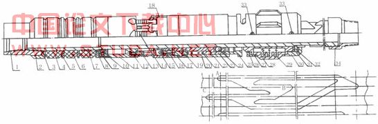 1-上接头 2-调节环 3-“O”型圈 4-边胶筒 5-隔环 6-中胶筒 7-中心管 8-楔形体帽 9-档环 10-防松螺钉 11- 楔形体12-防松螺钉 13-限位螺钉 14-卡瓦 15-大卡瓦档环 16-固定螺钉 17-连接环 18-小卡瓦档块 19-防松螺钉 20-护罩 21-弹簧 22-锁环套 23-档球套 24-档球 25-顶套 26-扶正体 27-压环 28-摩擦块 29-压簧 30-限钉压环 31-滑环 32-轨道销钉 33-防松螺钉 34-下接头
