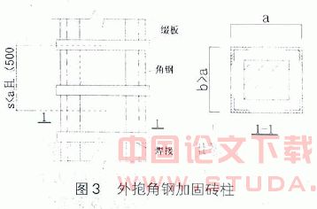 用水泥沙浆将角钢粘贴于受荷砖柱的四周,并用卡具卡紧,随即用缀板与角钢焊接连成整体,去掉卡具,粉刷水泥浆以保护角钢如图3所示。