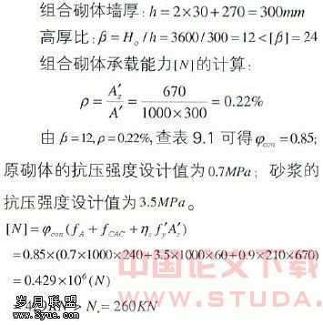以上计算中略去了原墙体的承载能力,可见组合砌体的加固效果是十分安全的,按计算两边的混凝土可以更薄,但小于60mm将引起施工的困难,故仍按原来的构造要求定的方案进行加固。