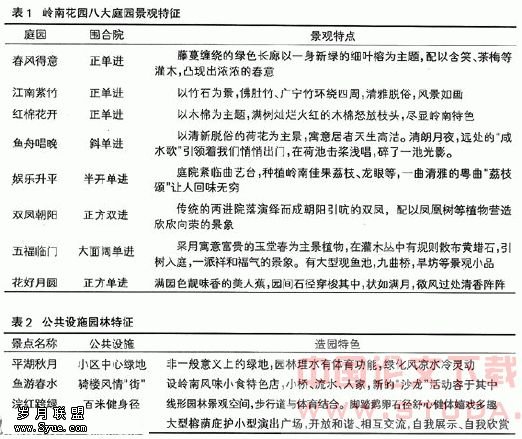 公共设施及其园林化环境贯穿岭南花园。小区2万多平方米的“中心绿地”于移步换景间,内外反串,处处可体味到类似“池边雨打芭蕉,回廊粤韵清唱”的意境。岭南花园小区“十二景”中,“庭外之园”有4处,同样巧夺天工,韵致神现(表2)。
