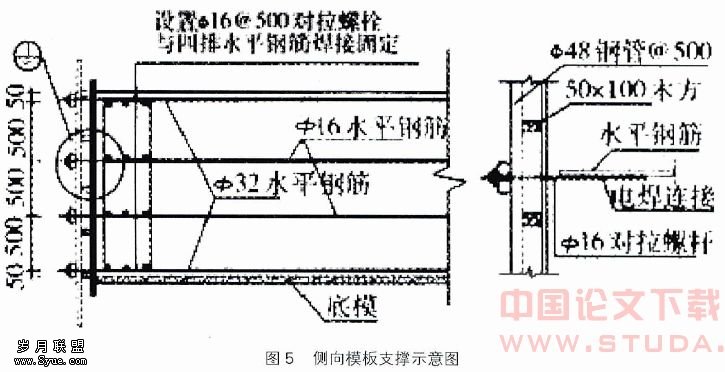 1600mm厚板侧边模板采用18mm厚木胶合模板,50mm×100mm木楞@300mm,外横楞采用双根φ48×35mm钢管,下端及上口离侧模边50mm,中部间距@500mm,φ16mm对拉螺栓间距为@500mm双向,并与板内水平钢筋焊牢,做法(见图5)。