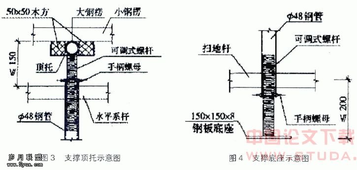 每根立杆下均设置底座,底座安装在立杆根部,防止立杆下沉,并将上部荷载分散传递给下层楼面。底座采用脚手架上使用的可调垫座,由150mm×150mm×8mm钢板、立杆管、可调式螺杆、手柄螺母等组成,垫座与竖向钢管连接外露部分距离应控制在200m之内(见图4)