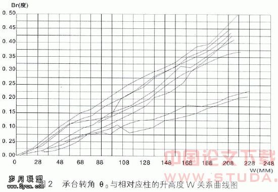 在9#~16#柱每柱靠近承台面(离承台面约20cm)柱的内、外侧各装一个百分表观测承台在西边柱顶升时每级的变形值,根据两个表的差值除以两个表的距离即可求出承台的转角。9#~16#柱的承台的转角θ0与相对应的1#~8#柱的顶升高度W关系曲线如图2所示。从图2可看出θ0~W基本成线性关系,9、10柱的承台的转角θ0要比其它柱的基础承台基础刚度大。