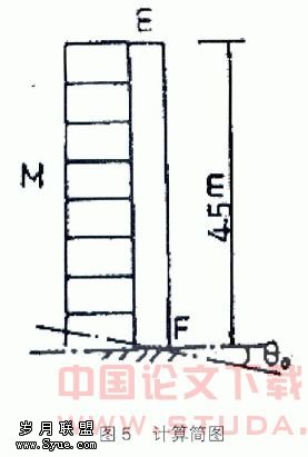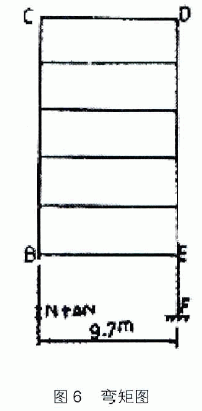 一栋已完工的混凝土框架楼房,尽管采用截柱顶升纠偏方法纠正楼房的倾斜,但仍然对框架各节点产生一定的附加弯矩,这种附加弯矩之后会对框架结构造成损害,必须预先考虑,现对其作些分析计算。由于二楼至六楼所有楼板及梁组成了刚度较大的多层单跨梁体系。可以将楼房取图5的简图来分析计算。A点为用千斤顶支承,在垂直方向有水平方向可自由的支点,N为结构自重,△L为顶升纠偏时附加上千力。F点为固定端但在偏心荷载作用下仍能作相应转动(θ0)的。BCDE由梁、板组成刚度远大于EF的一楼柱的刚度,因此现假定BCDE为近似刚架。则当在A点顶起时产生一附加上升力△N,在EF段则受一弯矩M作用(图6为弯矩图)。则E点的转角可用悬臂梁受纯弯的公式求得: