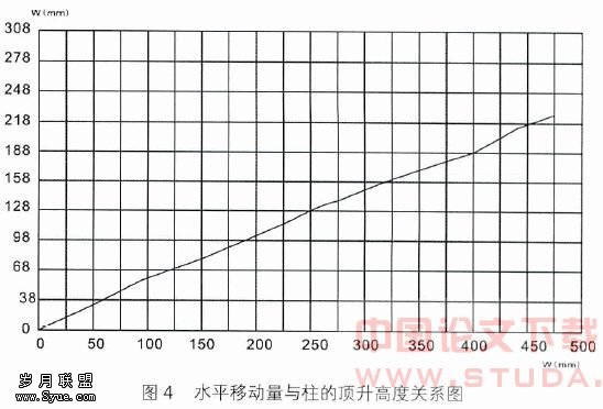 在楼房的四个角观测顶升后的纠偏量,图4所示曲线是东北角楼顶在顶升过程中的水平移动量与1#柱的顶升高度的关系。W~u关系近似为线性关系。