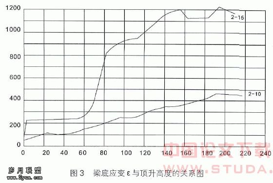 梁的裂度观测选择了2~10、7~15柱的一楼连接大梁。在靠近10#、15#柱的大梁梁底分别安装千分表,测量顶升过程中的应变变化情况。测量结果如图3(为拉应变),从图中可看出,梁底应变 与顶升高度的关系,2~10梁应变与顶升高度和变化比较有规律。而7~17梁的梁底的~W变化规律性差。主要原因是由于7#柱顶升时支承梁底打入铁垫块时敲击震动影响。而2~10梁以上的所有隔墙未拆除,可削弱由于2#柱顶升时支承梁底打入铁垫块时敲击震动影响,其观测结果比较可靠。根据现场观察7~15梁,并未产生裂纹,所以7~15梁的应变观测结果受震动影响大,未能真实反映梁底的应变变化情况。同时在顶升过程中派专人观测梁的动态,观察结果是所有东西方向的大梁在顶升过程中均未产生裂纹,而且西边横梁的原有裂缝在顶升纠偏后都有闭合的迹象。只是在西边顶升高度达到10~11cm后9#、10#、11#柱的内侧开始产生裂纹。顶升纠偏终止后,最大的裂缝宽度至约0.5mm。产生裂缝的主要原因是顶升产生的附加弯矩作用拉裂的,而9#、10#梯形的加固后的承台刚度大,因此其相应的附加弯矩也较大。由于裂缝较小并不影响其支承强度,而且在长期荷载作用下通过应力调整裂缝将逐渐闭合。