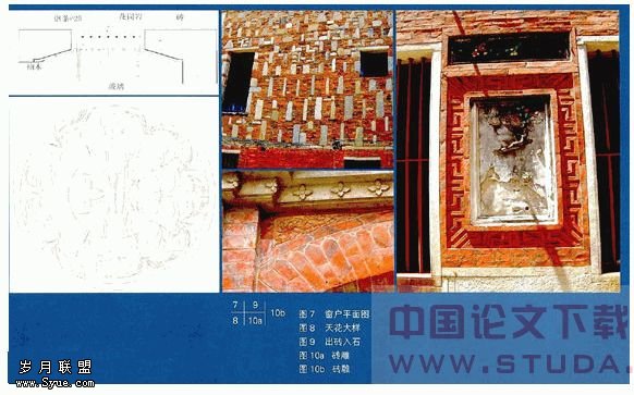 由于福建闽南地区的石雕技术闻名全国,因而雕刻在该建筑中也被广泛的运用。在建筑的立面上,尤其是正立面的砖花,用红砖组砌拼贴成各种图案,和使用红砖墙雕刻壁画,这也是闽南一种特有的装饰手法,其门洞口的雕花均表现出闽南传统的石雕工艺,其技术精湛,造型优美,很好地体现了地方的特色,也表现了闽南居民对石头与雕刻所特有的感情。(图10)