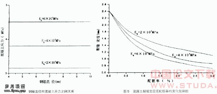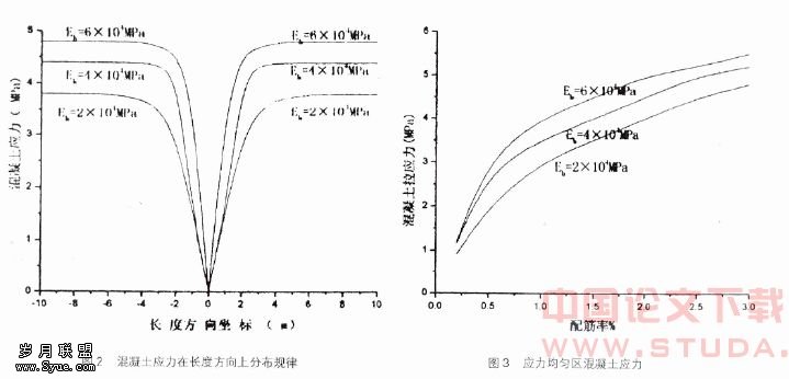 图3给出了应力均匀区的混凝土应力随着配筋率增加的变化情况,可以看出:①随着配筋率增加,混凝土内的应力明显增加。这就使得混凝土可能在已有裂缝的邻近区域很快地达到混凝土的极限抗拉强度,从而引起次级裂缝。这样,随着配筋率的增加,钢筋混凝土构件的裂缝间距变小了,裂缝变密。②类似于图3,的增加提高了应力均匀区的混凝土应力。