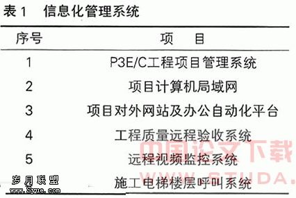 在大型工程(如中央电视台新台址工程、上海环球中心工程)的信息化管理成功经验基础上,推广采用先进的信息化管理系统。以保证信息管理规范化、化,确保信息的准确性、及时性、可追溯性,利用现代化信息管理方式改变管理模式,提高工作效率、管理水平和协同能力。本工程推广应用的信息化管理系统见表1。
