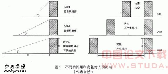 楼前广场的规模有大有小,它的空间尺度界定是设计成败的关键之一,通常包括人与建筑、空间的关系,建筑与建筑的关系,建筑与空间的关系等等。最为直观的标准是广场空间内间距和高差对人的心理和生理所产生的影响。由于在平日生活当中,人们总是需要一种内聚的、安定而亲切的环境,所以上很多城市广场空间的D(建筑高度)和H(建筑间距)的比值大约为1~3之间。卡米洛·希泰(Cami Sitte)在欧洲广场设计的手法中提出广场宽度的最小尺寸等于建筑高度,最大尺寸不超过建筑高度的两倍,可以把这一论断运用到楼前广场与高层裙楼之间的关系处理。