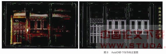 采用三维激光影像扫描技术,能在不损伤建筑物的条件下,快速采集古建筑物外部表面的精确数据。通过使用软件,可以快速地为扫描获得的点云赋予相应的彩色信息,再经过加工便制作成正射影像,向用户展示一个完全的实景彩色图像。如图1所示。相对于以往近景摄影来说,正射影像具有更为精确的可量测性,古建筑设计和保护人员可以精确对门、窗、柱、梁等构件进行测量,如图2所示。借助CAD便可以制作出用于施工的CAD数据图,如图3所示。