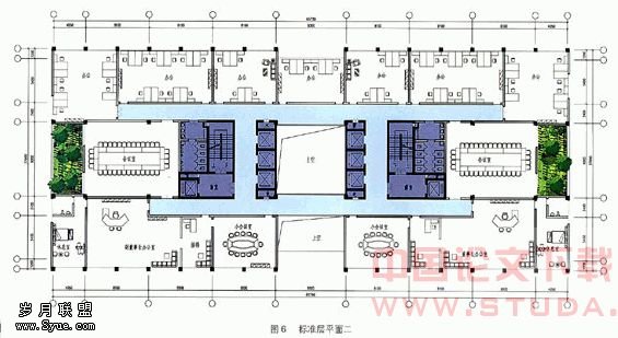同时,建筑山墙面的处理也考虑到自然界的不利影响,并将之变为方案中的特色。办公层在东西侧利用中部开口设置会议室或大空间办公,为避免太阳直射对办公空间的影响,建筑引入阳台这一元素,每两层为一通高单元从而形成建筑的边厅。通高阳台种植绿色植物,既能有效阻挡夏季阳光对两侧办公空间的直射,又改善了室内小气候,创造了良好的视觉环境和开阔的视野,为室内办公环境营造一片绿意。(图6)