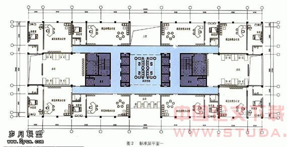 郑州地处中原,四季分明,光线充足,合理利用自然光源,减少人工照明是节约能源的有效手段。外窗的设置无疑是最简单有效而自然的方式。建筑南北向布局,中央设置核心筒,将主要办公空间布置在主要朝向。中央核心筒的布局常见于规模较大的高层建筑,一方面便于管线的集中设置和有利于结构的布置,另一方面避免对采光面的侵占,使周围房间尽可能地得到直接采光与通风。同时,在需要的情况下,每层楼根据需要还可划分为开放式、组合式或独立单元的办公室,每个工作区都可得到相似的空间质量。但中央核心筒的布局通常带来的一个不利因素就是内部走廊的封闭性。针对这一点,本项目在设计中通过中庭的设置来补充部分自然光线,中庭占据三层高空间,并沿主楼呈“之”字形交错上升,使标准层每一层中部均能得到中庭提供的自然光线,从而打破传统内走廊的印象,形成开敞,舒适的交往场所。(图2)