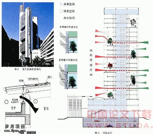 在自然通风的基础上节省能源和创造舒适的室内环境是本建筑设计所遵从的基本原则。在此方面,诺曼·福斯特在法兰克福商业银行设计中的应用可谓经典。福斯特将塔楼设计成一个中空的三角形塔楼,由三个角的核心空间组成支撑体系,中庭每12层为一段,每8层为一个办公单元,同时将三角形的一边设计成四层高的花园,沿塔楼螺旋形排列。办公室可向中庭开窗,一年中的大部分时间都可以采用自然通风。(图3)