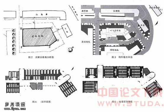 从校园总体规划图中可以看出,将军楼的选址位于教学区、宿舍区与活动区的空间节点上,针对建筑周边的既有建筑和道路的情况,对建筑平面的外轮廓进行限定,从而与环境建立起一种协调的关系,加强校园空间的整体性。考虑到建筑物的功能要求、地段的具体条件以及建筑物本身的性,建筑总体平面采用集中式布置。一般来说,集中式布置较分散式布置更能节约用地,因为采用集中式布置,建筑场地、道路、日照与防火间距等所需的空地比较少,这样,不仅能充分利用土地,并能兼顾之后的用地。具体的方法如下: