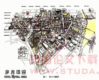 东北部八所常春藤联盟(Jvy League)成员之一的世界著名大学,成立于1740年。它位于费城中央商务区的西侧,与费城中心隔河相望,占地108.86hm2(图1)。建筑学子对其并不陌生,我国最早的一批留美建筑家梁思成、杨廷宝等就毕业于此,而其建筑系更因建筑大家路易斯·康而久负盛名。笔者曾于2006年12月赴美国调研期间亲历其校园空间,以下的路径及视点选择均来自笔者的资料收集。