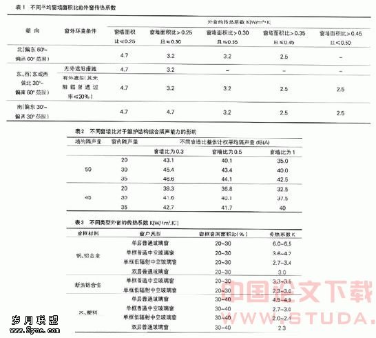 a.窗墙比:不同朝向的窗墙比的大小对能耗有很大影响(由于外窗的传热系数一般来说比外墙小很多,影响外围护结构的综合传热)。随着窗墙面积比的增大,外窗的传热系数要求更小,以达到相近的节能效果。不同朝向、不同平均窗墙面积比的外窗传热系数见表1。