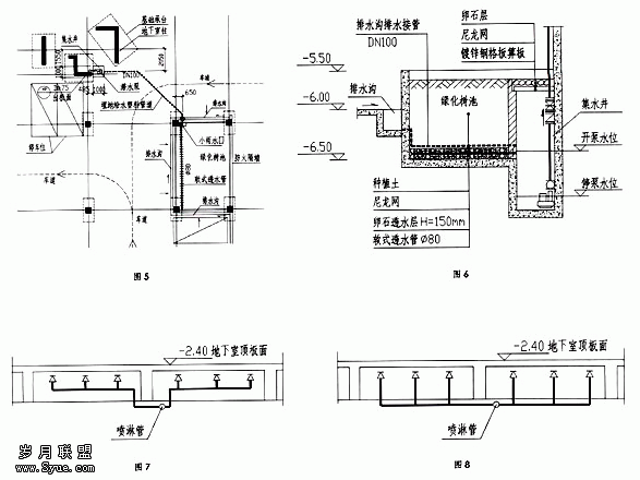 这种做法的主要弊端是:大量的管线预埋在底板下,增加了管道渗水的可能,尤其是沿海地区地下水位较高,一旦管道断裂或接口松动,就会造成地下水的大量渗入,致使水泵经常运转,增加能耗。华发新城一期地下室就有这种渗水情况的发生。笔者认为图6的做法较为合理,集水井设于树池内,井盖板作为雨水口箅板,用卵石铺盖,既满足了排水,又起到美化环境的作用。整个系统无预埋在底板下的管线,故较为安全实用。