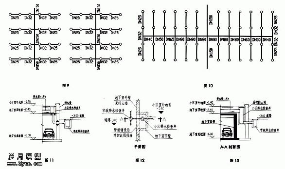 合理地布置配水干管同样也可以节约投资。图9的做法在一些设计中是经常出现的。而对于此种情况,在华发新城三期地下车库的喷淋系统设计中,我们则按图10的方式进行配管。经过比较,两种方案在管材上的成本相差无几,但管件上的成本就相去甚远。因为图9中采用的卡箍接头的数量是图十的8倍!