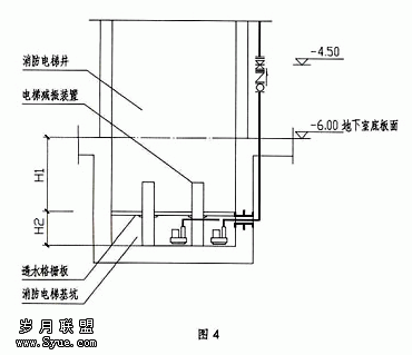 《高层民用建筑设计防火规范》(GB50045-95)中6.3.3.11条规定:“消防电梯井底应设排水设施,排水井容量不应小于2.00m3,排水泵的排水量不应小于10L/s。”常见的做法是在消防电梯旁另设集水坑,但这种做法既增加投资,又给结构设计带来诸多麻烦。经过论证,笔者采用了加深电梯基坑的方式,见图4。