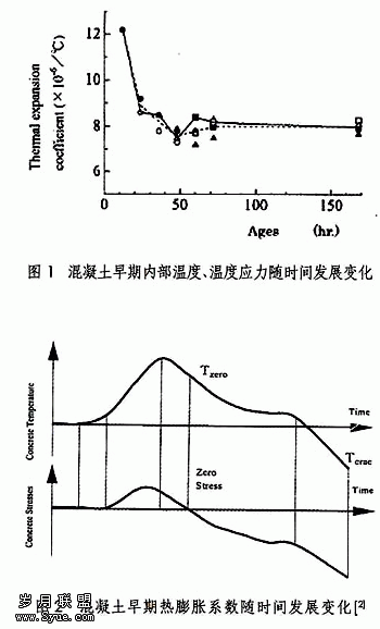 温度应力可表达成温差、弹性模量以及混凝土热膨胀系数的方程,而混凝土早期的热膨胀系数往往与混凝土内部湿度状况相关。若要对大体积混凝土早期温度应力做出准确的评估与预测,必须研究混凝土早期热膨胀系数及其随时间变化情况。而早期混凝土属于弹塑体,因此应用线形变形测试手段监测其热膨胀系数存在一定困难。对此一些混凝土学者开展的具有针对性的研究。日本学者I.Shi-masaki等人应用非接触式高精度位移传感器测定了混凝土早期的热膨胀系数。其研究结果见图2,可见混凝土早期热膨胀系数并非定值,而是随龄期逐渐发展变化,在浇筑后的几个小时后,混凝土热膨胀系数变化尤为明显。以往的混凝土温度应力中经常常将混凝土的热膨胀系数视为定值处理,这种方法显然与实际情况存在较大偏差。 同时,由于混凝土是热的不良导体,水泥水化过程中释放出的水化热短时间内不容易散发。特别是大体积混凝土,当产生大量水化热时,混凝土内外产生很大温差,从而导致混凝土内部存在温度梯度,温度梯度的产生导致温度变形梯度以及层间约束形成,从而加剧了表层混凝土内部所受拉应力作用,导致表层混凝土开裂危险性的提高。