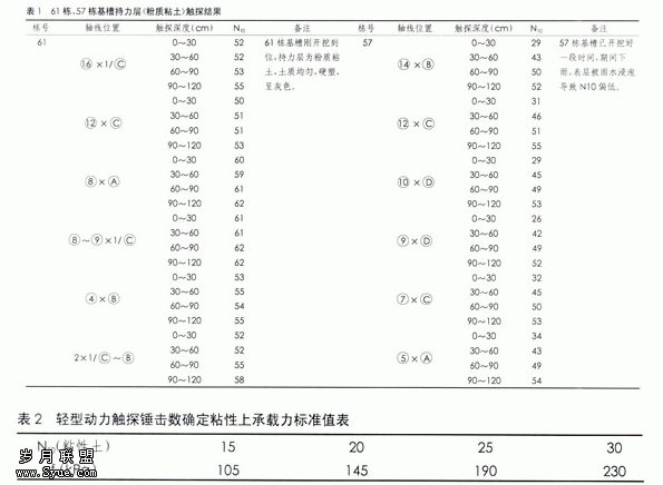 工地现场基槽已开挖到持力层粉质粘土,通过现场随机选点触探,该楼盘第61栋和57栋的轻型圆锥动力触探结果如表1所示: