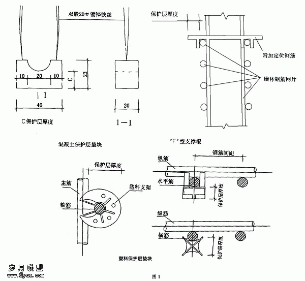 作者认为:一是抓施工前技术交底;二是抓过程中要素控制。在施工前,应针对不同的工程部位,根据设计施工图纸、相关标准图集及现行施工验收规范,确定正确的保护层。保护层的厚度并非千篇一律,不同的构件,不同的设计要求厚度不同。因此,在对操作者的技术交底中必须明确此厚度,否则很容易造成返工。施工过程中,重点要做到规范操作,首先钢筋加工尺寸必须准确,底板下铁、楼板、梁底面保护层可使用塑料、混凝土垫块或大理石边角料垫块。墙体、柱、梁侧面钢筋保护层控制宜采用塑料垫块和“F”型支撑棍,墙体结构放在外侧的水平筋上,梁柱结构放在箍筋上。结构各部位钢筋保护使用垫块形式如图1: