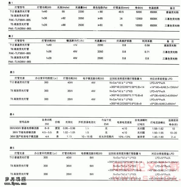 从上述各项对比中可知,与电子镇流器在自身功耗、光效比方面占有明显优势。还是以上述办公室为例,假设我们将原来的三种灯管分别配置传统电感镇流器,则其数据见表5。