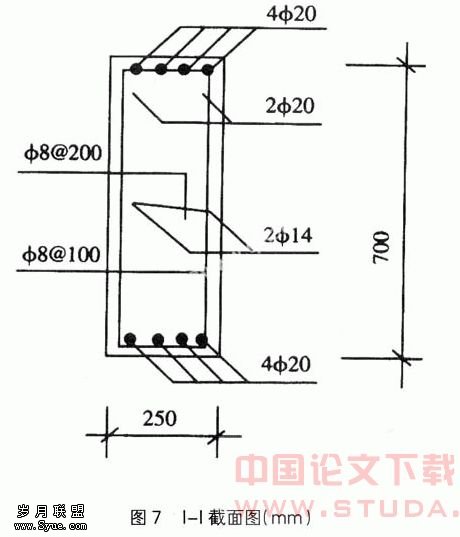 7)以M作为I-I截面弯矩设计值计算AS,并重新排列上部钢筋。已知:AS'=1256mm2,h=700mm,as=60mm(两排钢筋),as'=35mm(一排),ho=h-as=700-60=640mm,fc=11.9N/mm2, =1.0M= fcbx(ho-x/2)+fy'AS'(ho-as') 即:463.7712×106=1.0×11.9×250×x×(540-x/2)+300×1256×(640-35),所以x=175mm>2as'=70mm。因为fcbx=fyAS- fy'AS',故:As=fcbx/fy+As'=1.0×11.9×250×175)/300+1256=2991mm2。为了与原设计统一,选用1020的Ⅱ级钢筋。