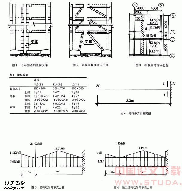 10)MN梁在I-I截面采用措施一后与原设计相比,梁上部附加钢筋数量增加偏多,根据I-I截面形状,1020也无法按两排排列,若排成三排,则需令as=80mm后重新计算(计算从略);就本工程而言,可采用措施二:设计竖向支撑来解决。由于本工程基础为软土地基,故可选用图3中的竖向支撑形式。