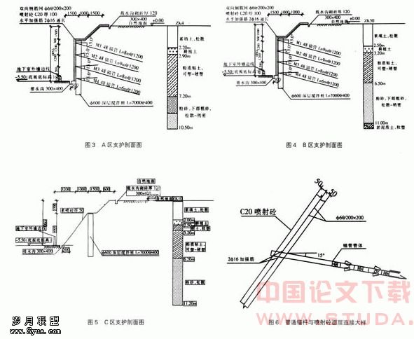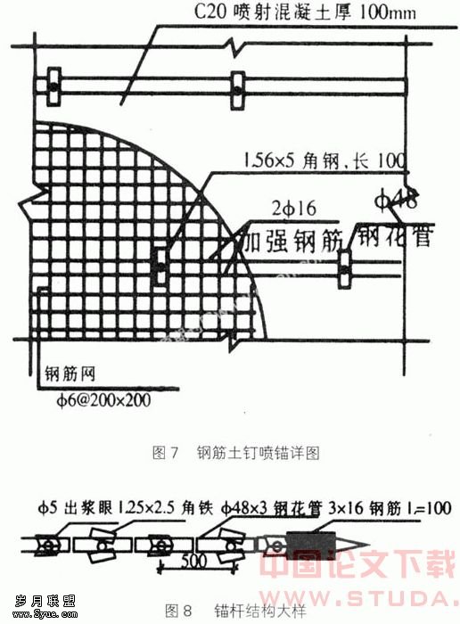 普通锚杆采用Φ48钢花管作为锚杆,长度为6m~9m,倾角15°,压力灌浆水泥采用32.5R普通硅酸盐水泥浆,杆采用底部一次注浆,注浆压力达到0.6MPa~0.8MPa,浆注满后稳压3min~5min,注浆孔附近的混凝土应具有抵抗注浆引起的压力抗散作用;②钢筋焊接长度:单面10d,双面5d;若采用搭接,搭接长度为40d;③坡面采用挂钢筋网喷射混凝土,钢筋采用Φ6@200×200,骨架钢筋采用2Φ16,沿锚杆位置布置。喷射混凝土总厚度100,强度等级为C20,见图6、7;④锚固体强度均大于设计强度的70%,方可进行下一层的土方开挖;⑤在上层钢花管锚杆注浆完成一定时间后,再进行下一层的土方开挖,并对该层进行喷锚支护,喷锚工作完成后,及时对基坑底部排水沟、集水井的施工。