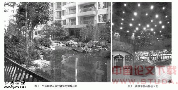 园林风格从地域上划分可以分为中式园林及异域风情园林两大类。中式园林以庭台楼榭小桥流水等传统建筑元素表现,这种园林当然与中式建筑搭配更合拍,另外在一些现代风格的项目中,借鉴了东南亚的手法,将楼宇首层架空作为小区内公共活动空间,其间点缀着木制屏风、门扇、石桌凳或月亮门等,以水体环绕架空区域,亭榭点缀其间,架空层临水一侧以栏杆、美人靠或堆石分隔,为了使中式园林与建筑物更好的过渡,在架空层顶标高的外墙安装中式屋檐外飘(图1)。异域风情的园林较为流行的有:欧陆皇家风格、澳洲风格、东南亚风格、现代风格等。欧陆皇家风格以中轴线来串联广场、喷水池、规整的台级、白色宝瓶栏河、圆顶亭子、人体雕塑等。绿化的特点:偏向于几何形状的构图,如:小型乔木、灌木修剪成圆柱、圆锥、球形,地被分成大块的色带,视觉上追求整体稳定性而忌杂乱。东南亚风格则融合了西式审美情趣与东南亚地方特色的道具(如:草亭、藤质家具、东南亚植物、平面及边界十分随意的泳池),反映了东南亚胜地的风情,适应了居住小区私人空间优雅休闲的定位,为许多楼盘采用。由于其植物与南粤地区接近,更适于岭南地区的园林工程。现代风格的园林伴随着现代建筑,硬质景观往往采用几何形状的铁艺、不锈钢制品、玻璃制品、陶制品、雕塑、景墙、张拉膜、水池,为了增强与人的亲近感,较多采用原色的木做步道、座椅、平台。色彩对比较强烈,以涂料、马赛克、高光面物体、表面粗糙的天然石来表现。