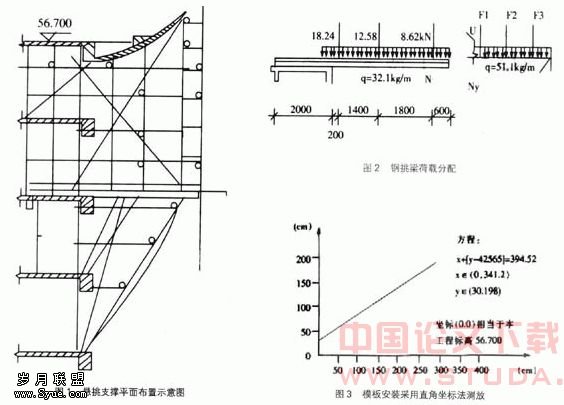模板安装采用直角坐标法进行测放,以外挑水平距离为横坐标(Xi),以模板底面标高为纵坐标(Yi),利用既定的每50cm水平距离,求出模板底标高(如图3),测放时,用水准仪测出Yi:500的水平面,并弹出曲面边缘线,然后架设水平钢管,敷设弧形钢筋骨架,并与水平钢管焊接,形成曲面网状承力系,上铺模板。