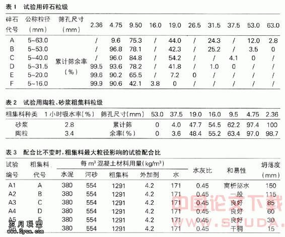 选取三种强度差异较大的粗集料进行试验。表中用水量为净用水量。净用水量是指不包括砂浆、陶粒粗集料1小时吸水量的混凝土用水量。试验配合比及试验结果见表5、表6。