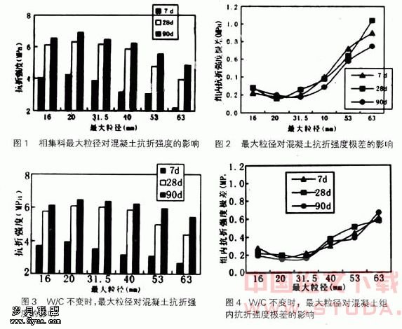 6.1粗集料最大粒径对路面混凝土的性能影响很大,混凝土的抗折强度随Dmax的减小而增大,当Dmax在31.5mm~40mm左右时,抗折强度高。抗折强度的组内极差随Dmax减小而减小。