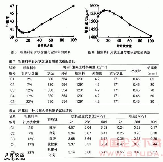 6.3混凝土拌合物的流动性随针片状含量的增大而减小,针片状含量在12%以内时变化不算太大,超过17%以后,对流动性影响很大;抗折强度随针片状含量增大而降低,在12%以内时,影响不是太明显;组内极差随针片状含量增大而增大。
