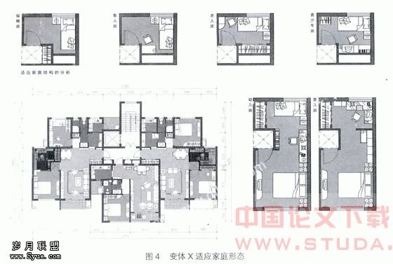 横向家庭结构演变。当家庭结构由单身家庭“1”、核心家庭“2(父母)+1(独生子女)”过渡到复合家庭“2(父母)+1(独生子女)+2(父母)”或“2(父母)+1(独生子女)+1(父母之一)”、不完整家庭“1(父母之一)+1(独生子女)+1(父母之一)”的过程中,变体×可根据不同家庭结构的需求分别设置为少年房、老人房、保姆房及客房等。