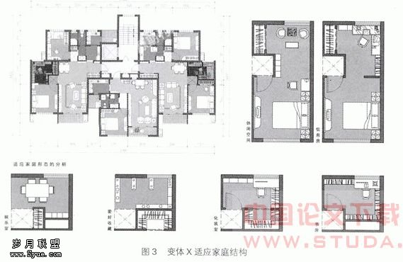 根据不同的家庭类型,利用变体×适应不同的功能需求。当家庭为外向交往型时,家庭朋友相对较多,变体×可设置为健身房、娱乐室、收藏间等,以满足朋友聚会、休闲、聊天等;当家庭为居家生活型时,侧重居室内部空间的家庭氛围营造,变体×又可设置为信息房、书房及化妆间等,以满足家庭内部生活的舒适和温馨。