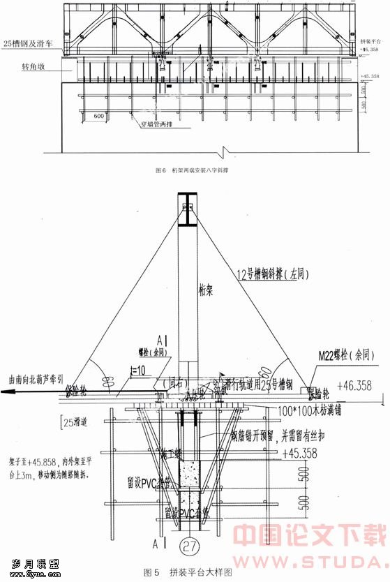 3.5 在(27)轴搭设桁架对接三脚架悬挑拼装平台,进行桁架竖立拼装,并同时在桁架两端安装八字斜撑,见图5、6。