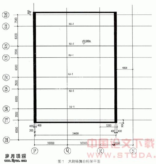 重庆大剧院工程项目总建筑面积103317m2,建筑高度64m,地上7层,地下2层,该工程结构复杂,为筒体、框架、剪力墙加钢结构组成。该工程内设大、中两个剧场,大中剧场舞台均为砼筒体结构。屋顶均为钢桁架,钢桁架搁置底标高分别为46m、37m。大剧场舞台桁架(GHJ-1)每榀长25.05m、高4.6m、自重20.3t,整体重量193t;中剧场舞台桁架(GHJ-2)每榀长22.55m、高4.1m,自重17.1t,整体重量133t。桁架由工厂标准化制作,预拼后将中间腹杆切断,上下弦杆各分两段,再运输到现场安装。下面仅对大剧场予以介绍,桁架布置如图1、2所示。