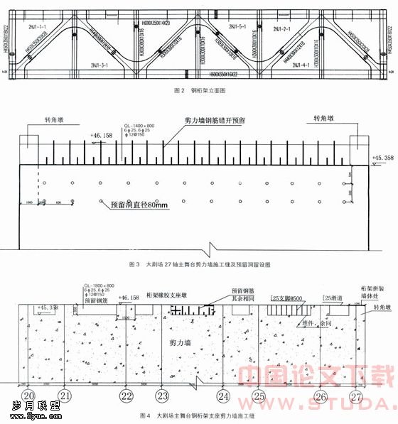 3.2 根据桁架橡胶支座的标高将(27)、(P)、R~S轴三向砼剪力墙施工至+45.358m,在P、R~S轴墙顶预埋滑道支脚埋件-10×300×300mm@500,27轴墙预留三脚架孔,见图3。