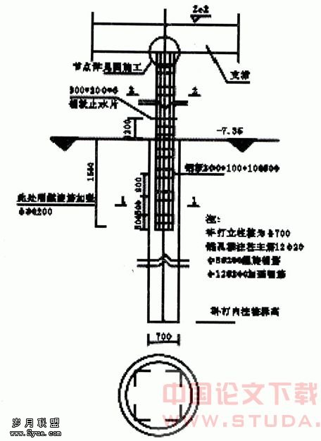 该基坑工程支撑面标高为-0.300m。地面标高为-0.500m。自然地面至支护钢管支撐梁顶面的深度2.500m,支护立桩桩采用桩径700钻孔灌注桩(图2)。四周压顶梁均采用现浇钢筋混凝土结构900×500,强度等级为C25。钢管支撑截面ZC1为φ630钢管,壁厚10mm;ZC2为φ426钢管,壁厚9mm;水平ZC3为φ377钢管,壁厚7mm。