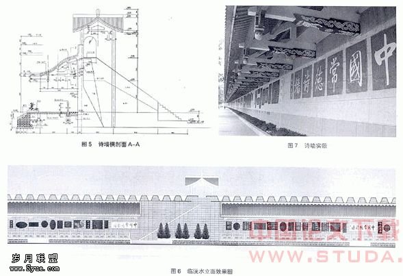 建筑中的情感因素很多,我们在设计过程中首先必须满足建筑空间的人体尺度和人文尺度这两大方面,使之和谐。这两者的和谐则表现为一种“人与物,物与环境,物与文化”之间的和谐,“人”指的是建筑空间的行为主体。使用主体和审美主体,“物”是指建筑空间本身,“环境”是指人类所处的自然和社会环境以及生存空间,“文化”则是指设计师必须考虑不同文化、宗教、习俗等对建筑空间的影响。只有把握好这种尺度,空间才会有情感,才会和谐,才会丰富。常德市中国常德诗墙及保护长廊把人与物、物与环境、物与文化之间的和谐表现得淋漓尽致(图1~6)。