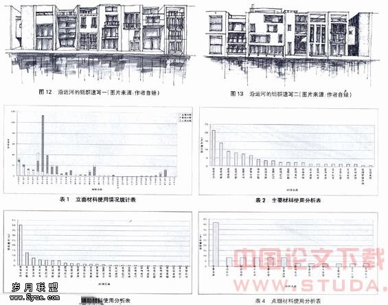 通过色彩研究发现,自由住宅群外立面的材料也是有选择性的(表2),超过一半的单元立面采用的与背景色接近的各种面砖作为主要材料,而其中与背景色为同一色相的中明度红色面砖更是所有主要材料中出现频率最高的,占总数的21.31%。在辅助材料和点缀材料中,除了无色相的清水玻璃外,使用频率最高的几种材料不是在色相上,就是在明度上与背景色接近(表3、4)。通过对立面色彩具有倾向性的引导,中明度低彩度的红色成为自由住宅群外部空间的主导色彩,不但实现了主体与背景的和谐统一,而且加强了外部空间紧凑连续的空间特征。