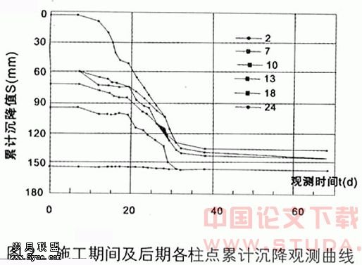 至此,全部施工完毕,总的纠偏沉降量为30~137mm,纠偏加固后,产生最大沉降的柱基与最小沉降的柱基沉降差只为22mm。部分柱点加固纠偏过程的沉降观测曲线见图2。