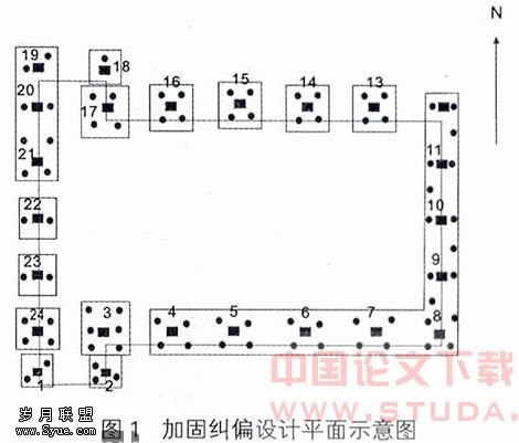 经上述验算,在进行加固纠偏钻孔布置时,除了考虑加固纠偏需要,尚要兼顾结构受力平衡。布孔方案为:在沉降量大的西南角1~3#桩基础加密布置旋喷桩,以设计承载力100%置换,共布置旋喷桩11支;其余柱下基础及南侧沉降较大的部分对应的柱号为13~24#和3~7#以设计荷载的60%进行置换,共布置旋喷桩37支;沉降较小(沉降值为3~9mm)的东侧8~12柱下可以少布孔,但考虑纠偏需要,仍以约40~50%的设计荷载进行置换,布旋喷桩10支(见图1)。整个基础设计布置加固纠偏孔76个。