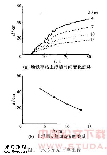 图3给出了在不同埋深下,地铁车站上浮的比较。由图3a可以看出,地铁上浮随时间的变化趋势基本相似,但随着埋深h的增大,结构的上浮量d明显减少。由图3b还可看出,上浮量d与埋深h基本成线性关系,在埋深为4m时,上浮量达44cm,而埋深为13m时,上浮量才17.6cm。