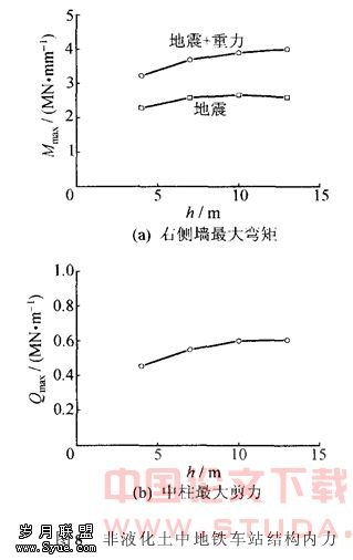 非液化土地铁车站结构最大内力出现的位置也是结构的交接处。图8给出地铁车站右侧墙的最大弯矩Mmax与中柱最大剪力Qmax随埋深的变化。随着埋深的增加,静力与地震共同作用导致的内力呈上升趋势;如果扣除静力的作用,地铁结构的动内力也有一定幅度的上升。与饱和可液化土中的地铁车站结构的内力比较,非液化土中的内力更大。但是这并不能说明在可液化土中的地铁结构更安全,因为在可液化土中的地铁结构会出现由于液化而导致的破坏,如上浮。