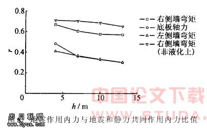 在地震作用下,地铁车站结构由于地震与静力共同作用所导致的内力大都随着埋深的增加而加大,其中由地震所致的内力,有的也会有一定程度的上升。但是,在地下结构的设计中,如果埋深较大,结构的强度也会增加,因此埋深大的地下结构极有可能更不容易破坏。图9给出了在地铁结构关键部位地震所致内力与地震和静力共同作用所致内力的比值r。可以看出,这比值随着埋深的增加而明显减小。这说明,地铁地下结构埋深大时的安全度有可能更高。而地铁结构破坏的现场实例说明,由于中柱在剪力及弯矩作用下的破坏而造成顶板坍塌是地铁车站结构破坏的主要形式之一[6]。而由图6d—e可以看出,在饱和可液化土中,中柱的动内力与埋深关系不大,但埋深大的地铁车站中柱强度会更高,因此,埋深浅的地铁车站结构破坏的可能性更大。在非液化土中,图8b所示地铁车站中柱的剪力有一定幅度的上升(弯矩也有类似趋势),但是如果考虑深埋地铁车站中柱强度远大于浅埋的中柱强度,浅埋的地铁车站中柱还是有可能更容易破坏。